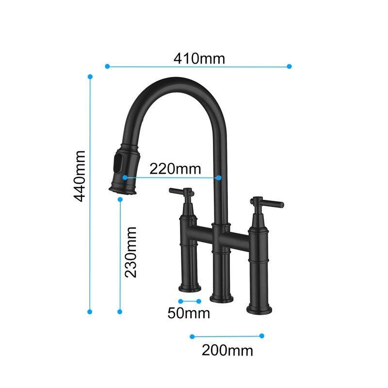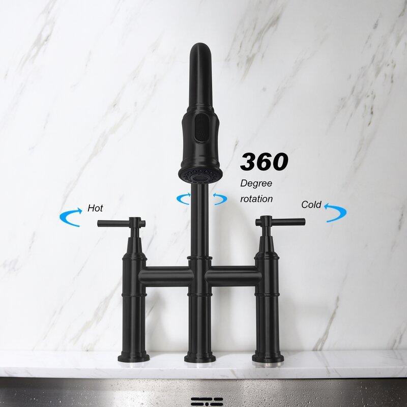 2. Bridge-type faucet design: The horizontal bar connects the hot and cold water handle with the faucet outlet, creating a bold and classic appearance-the drop-down nozzle provides flexibility for close tasks and expands the area around the sink; no need to separate Side of